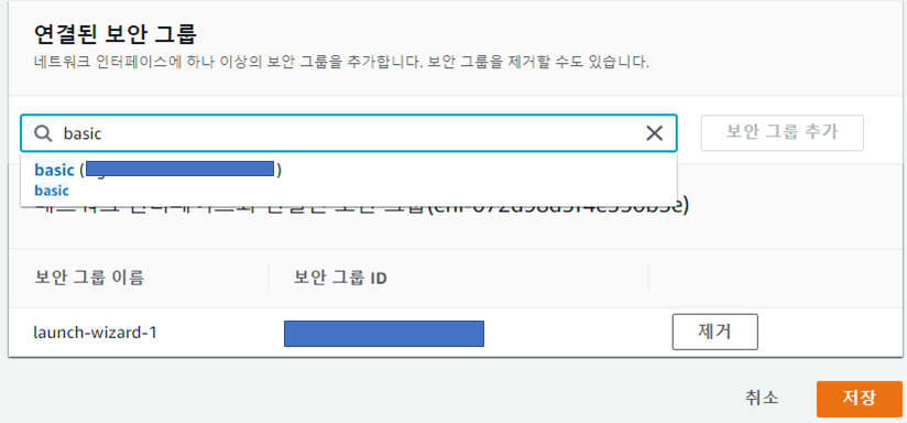 아까 생성했던 보안그룹 이름인 basic을 검색 -> basic 보안그룹 선택 -> [보안 그룹 추가] 클릭