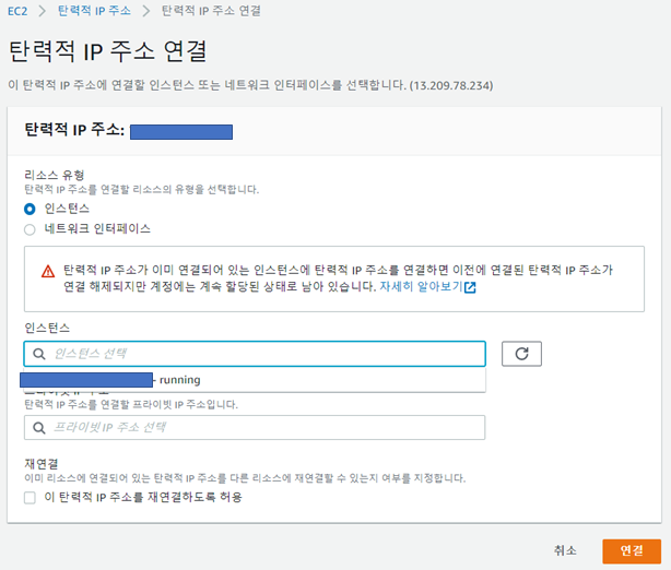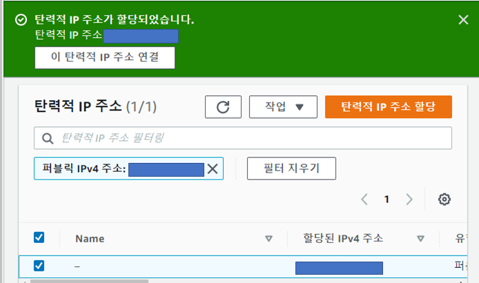 짜잔~ 어려운 것 없이 IP 할당! 바로 [이 탄력적 IP 주소 연결]을 선택합니다!