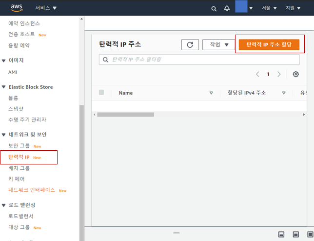 그래서 우린 탄력적 IP를 배정하여 하나의 인스턴스에 하나의 고정 IP를 지정하려 합니다 ㅎㅎ