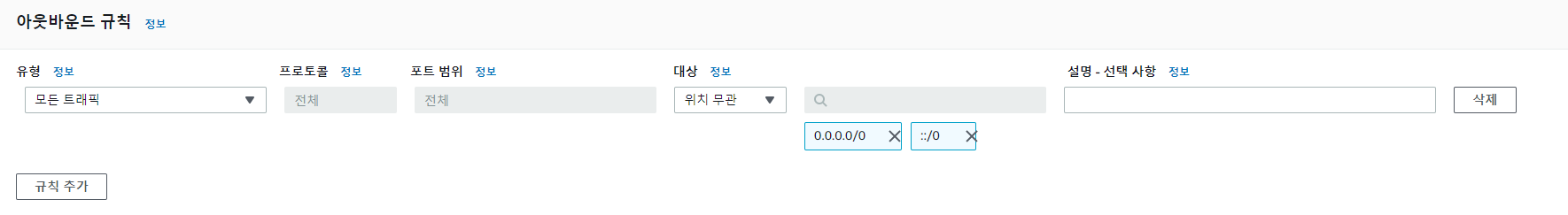 아웃바운드 규칙도 아래와 같이 넣어주셔야 합니다!