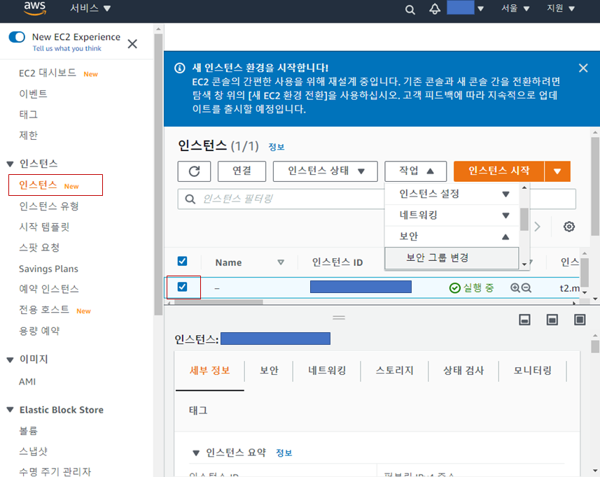 작업 -> 보안 -> 보안 그룹 변경을 클릭해줍니다~