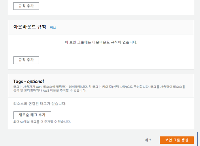 그리고 캡쳐엔 비어있지만 보안그룹 설명도 꼭 명시해주셔야 해요!