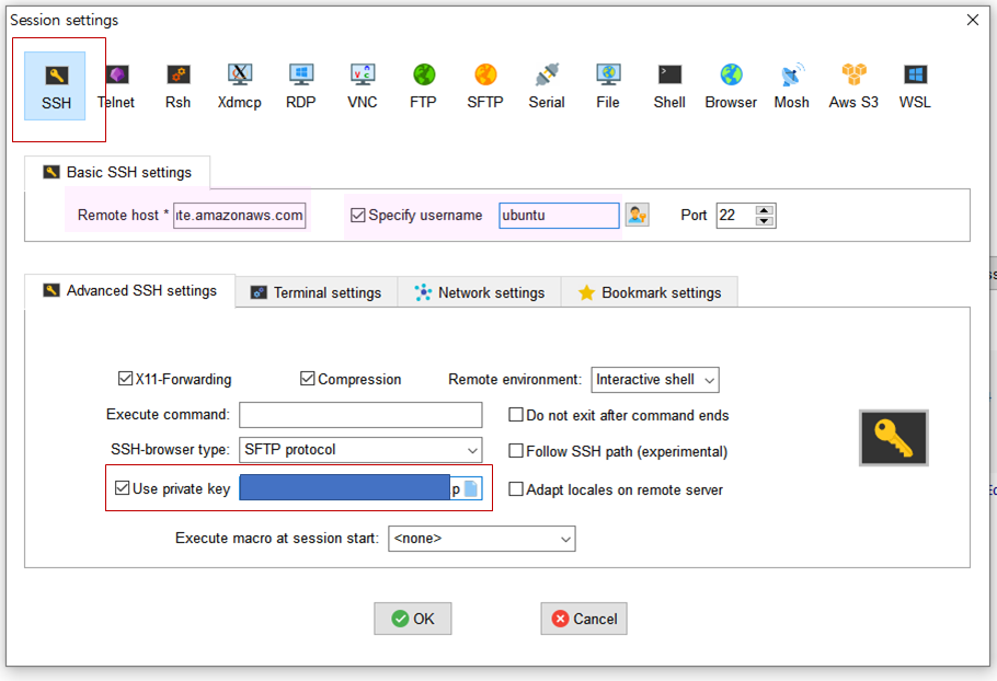 SSH 선택! Remote host 에는 인스턴스의 퍼블릭 DNS를 입력!