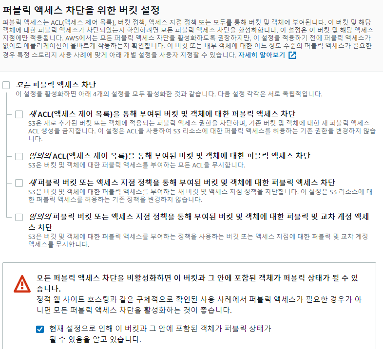 퍼블릭 엑세스를 차단하면 외부 접속이 불가할것이기때무네! 저는 모든 퍼블릭 엑세스 차단을 비활성화 했습니당