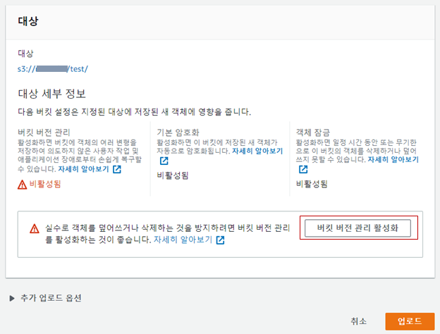 혹시 다른파일이 같은 이름으로 업로드 되어 덮어쓰는 경우를 방지하기 위해 저는 [버킷 버전 관리 활성화]를