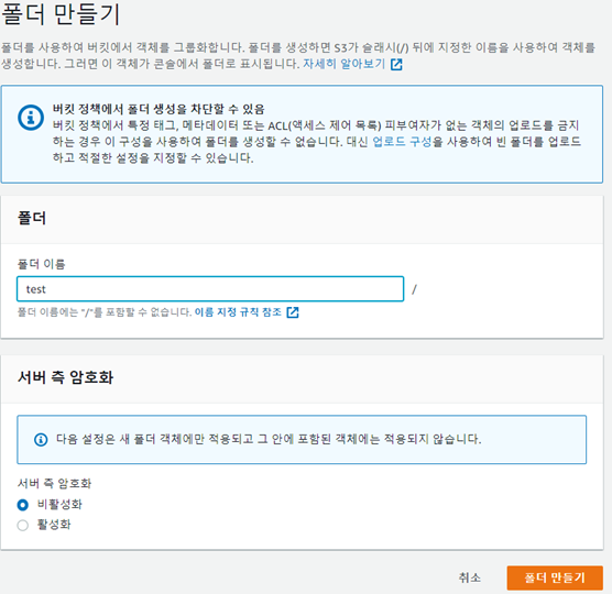 폴더명은 s3://"내버킷명"/"폴더명" 이런식으로 url에 적용되는 듯 합니다 ㅎㅎ