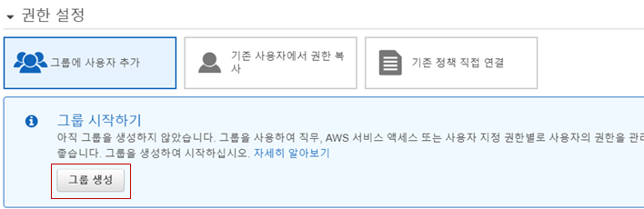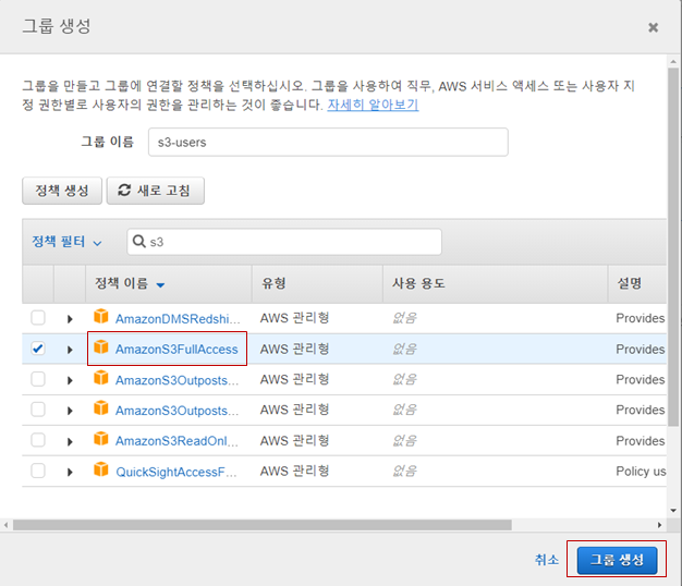 위와 같이 적당한 그룹명을 입력해주고, AmazonS3FullAccess 정책을 설정해주고, 그룹 생성!