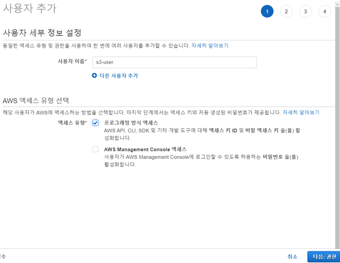우리는 액세스 키를 활용할 것이니까! 프로그래밍 방식 엑세스를 선택해주신 후 [다음:권한] 버튼 클릭!