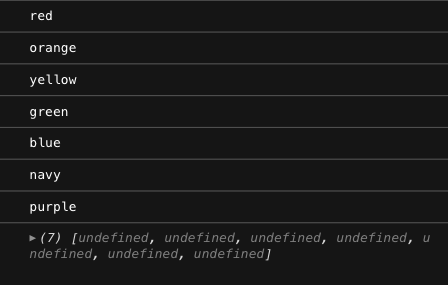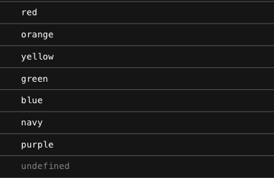 console.log(rainbow); //["red", "orange", "yellow", "green", "blue", "navy", "purple"]