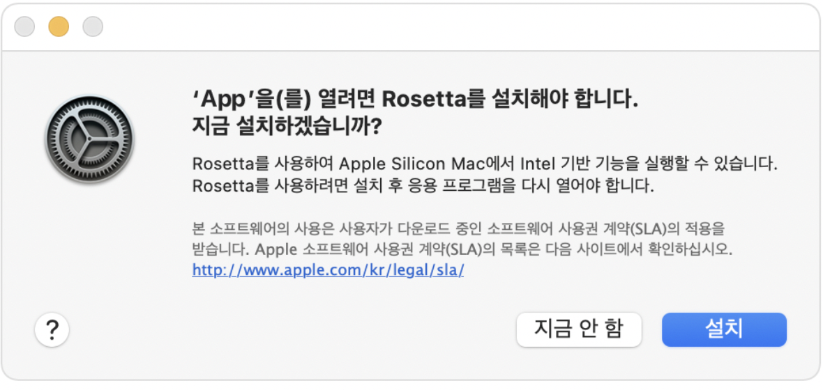 Intel만 지원가능한 앱을 실행하고자 하면 아래와 같은 창이 뜬다고 한다.